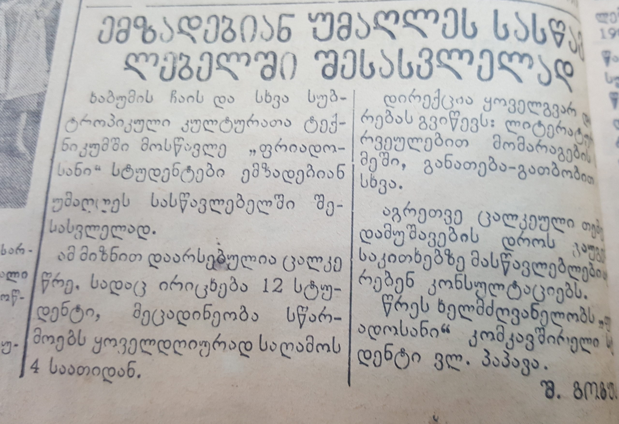 გსმენიათ, ხაბუმის ჩაის და სხვა სუბტროპიკულ კულტურათა ტექნიკუმის შესახებ? 30-ნი წლების ბოლოს ახალგაზრდები თბილისში გასამგზარებლად ემზადებიან. მათი ხელმძღვანელია ვლადიმერ პაპავა.