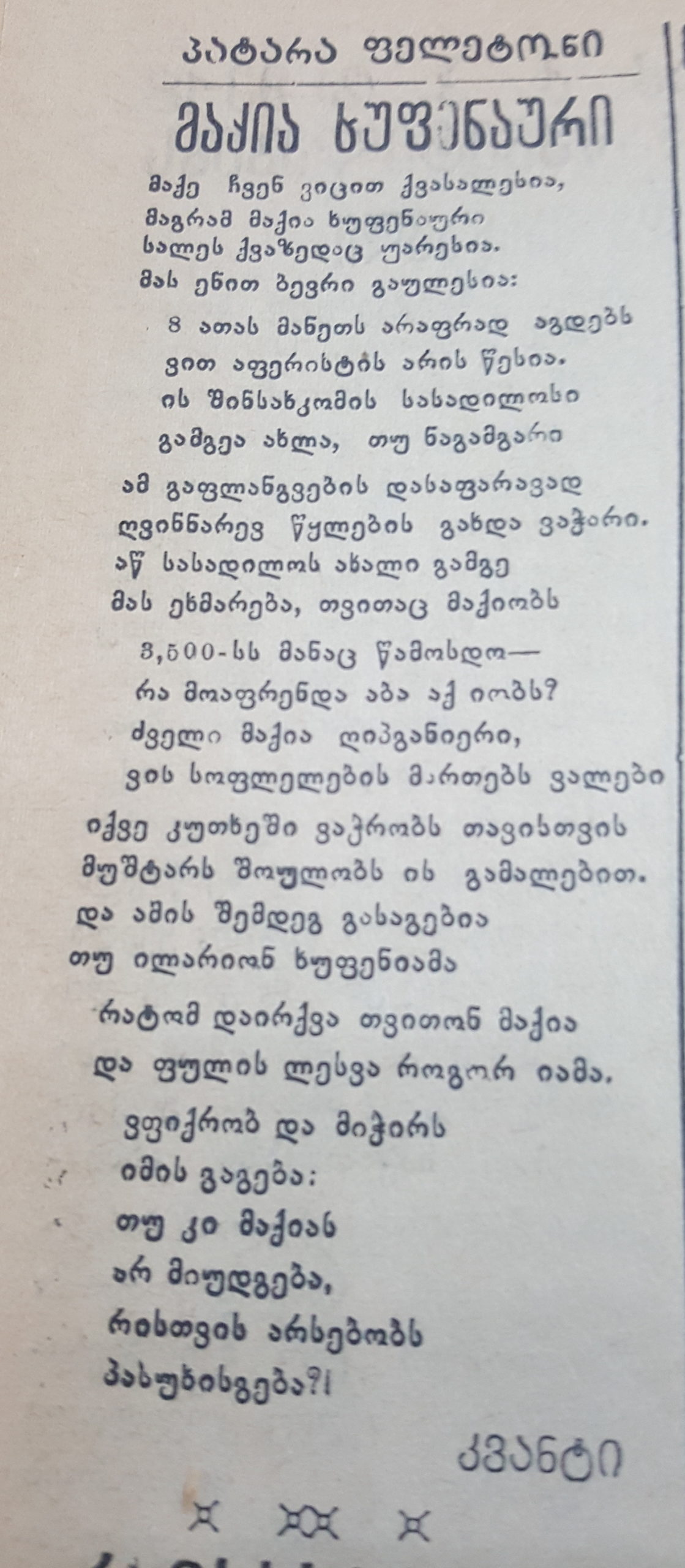 ა , კაცი! მუშაობდ , გაზეთებს დაატარებდა და მადლობაც დაიმსახურა